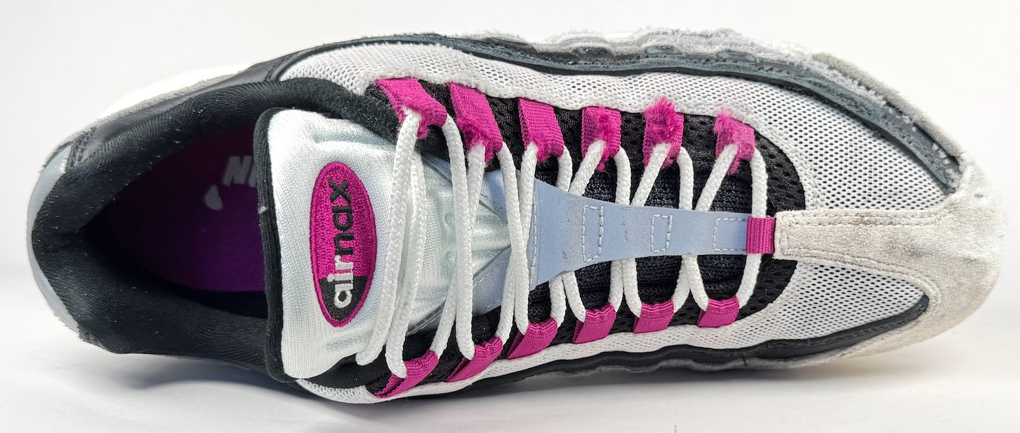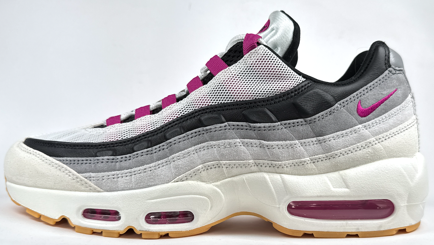 The Nike SB Air Max 95 retains its distinctive layered wave design and classic running silhouette. The toe box has been slightly slimmed for improved flick, though it still offers plenty of volume and a noticeably bulky feel. From above, the shoe appears sleek and slightly pointed, while from the side, the layered upper and taller profile create a commanding, standout presence.